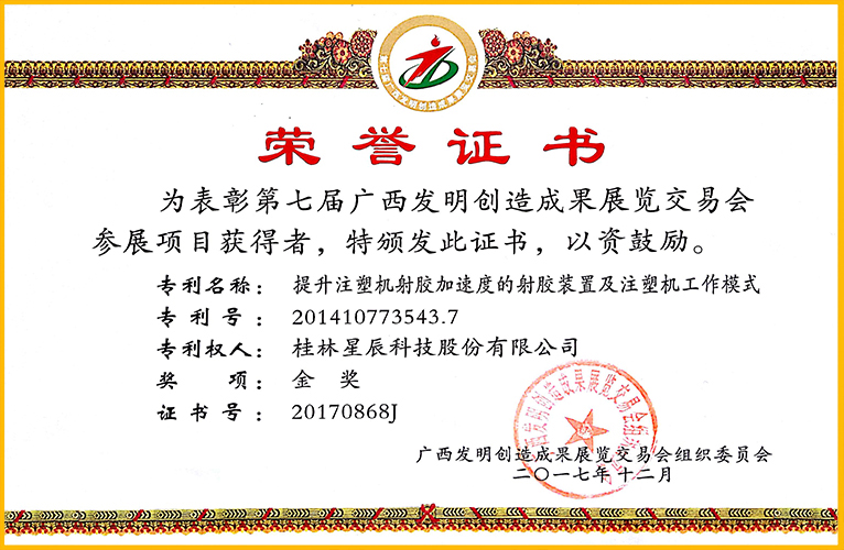 2017年12月,星辰科技專利“提升注塑機射膠加速度的射膠裝置及注塑機工作模式”榮獲第七屆廣西發(fā)明創(chuàng)造成果展金獎。