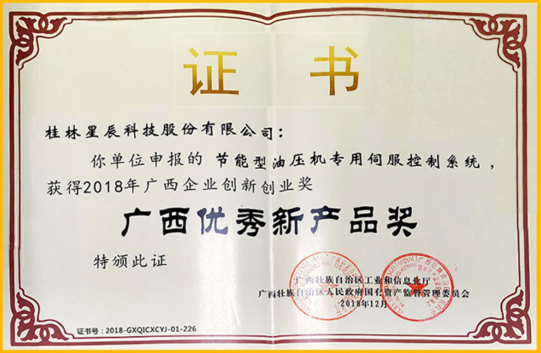 2018年12月,公司產(chǎn)品“節(jié)能型油壓機專用伺服控制系統(tǒng)”榮獲“廣西優(yōu)秀新產(chǎn)品獎”。