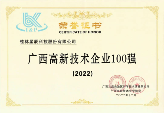 近日,廣西科技廳發(fā)布了2022年廣西高新技術企業(yè)百強榜單,桂林星辰科技股份有限公司成功入選“廣西高新技術企業(yè)100強”。